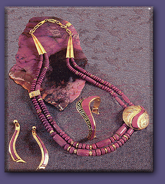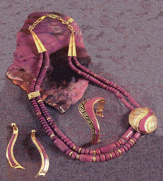 Neckpiece, "WaterSerpent Shield" 14kt. Gold/inlay lavender sugilite, paved diamonds, included bead dividers